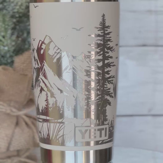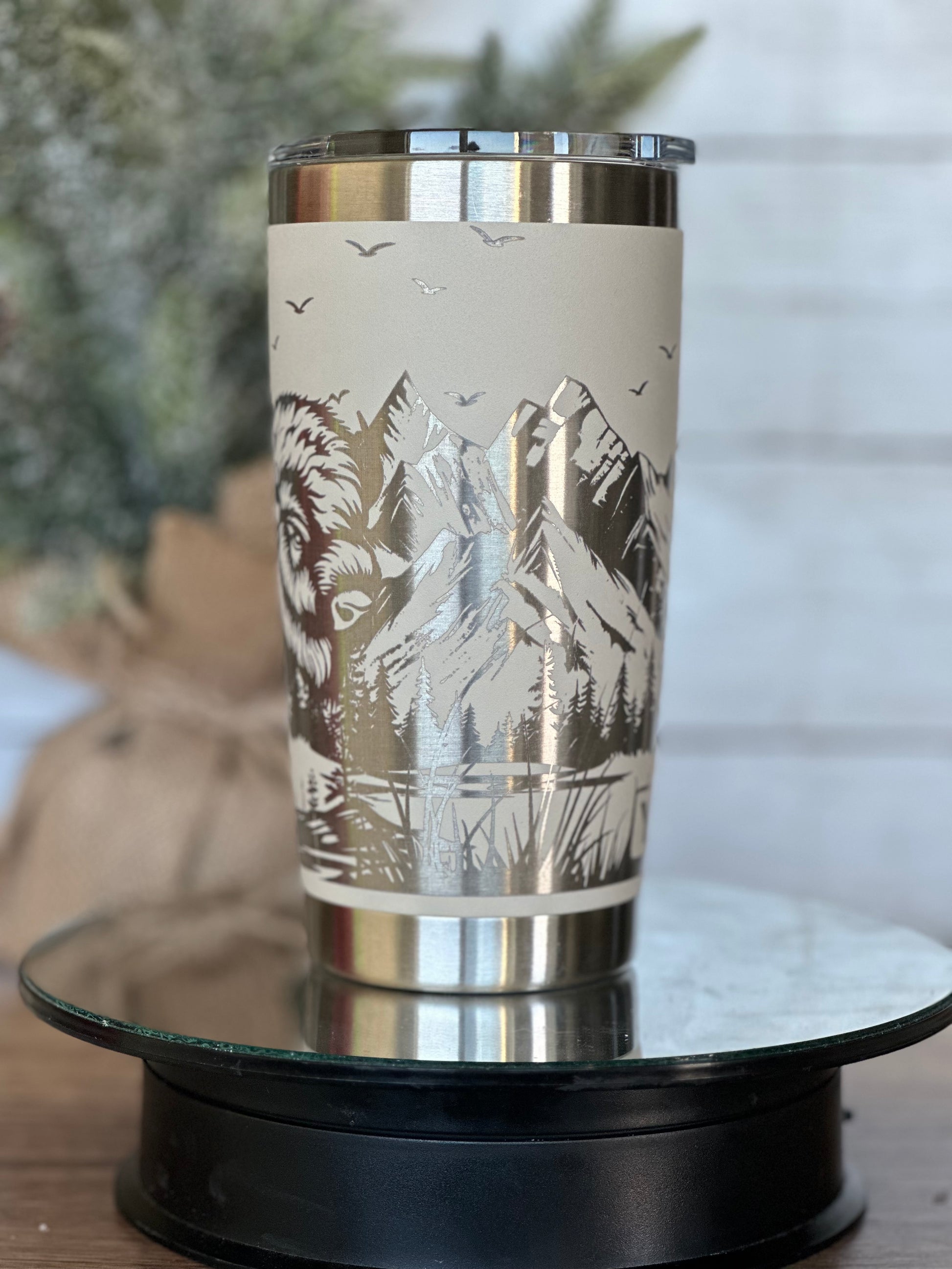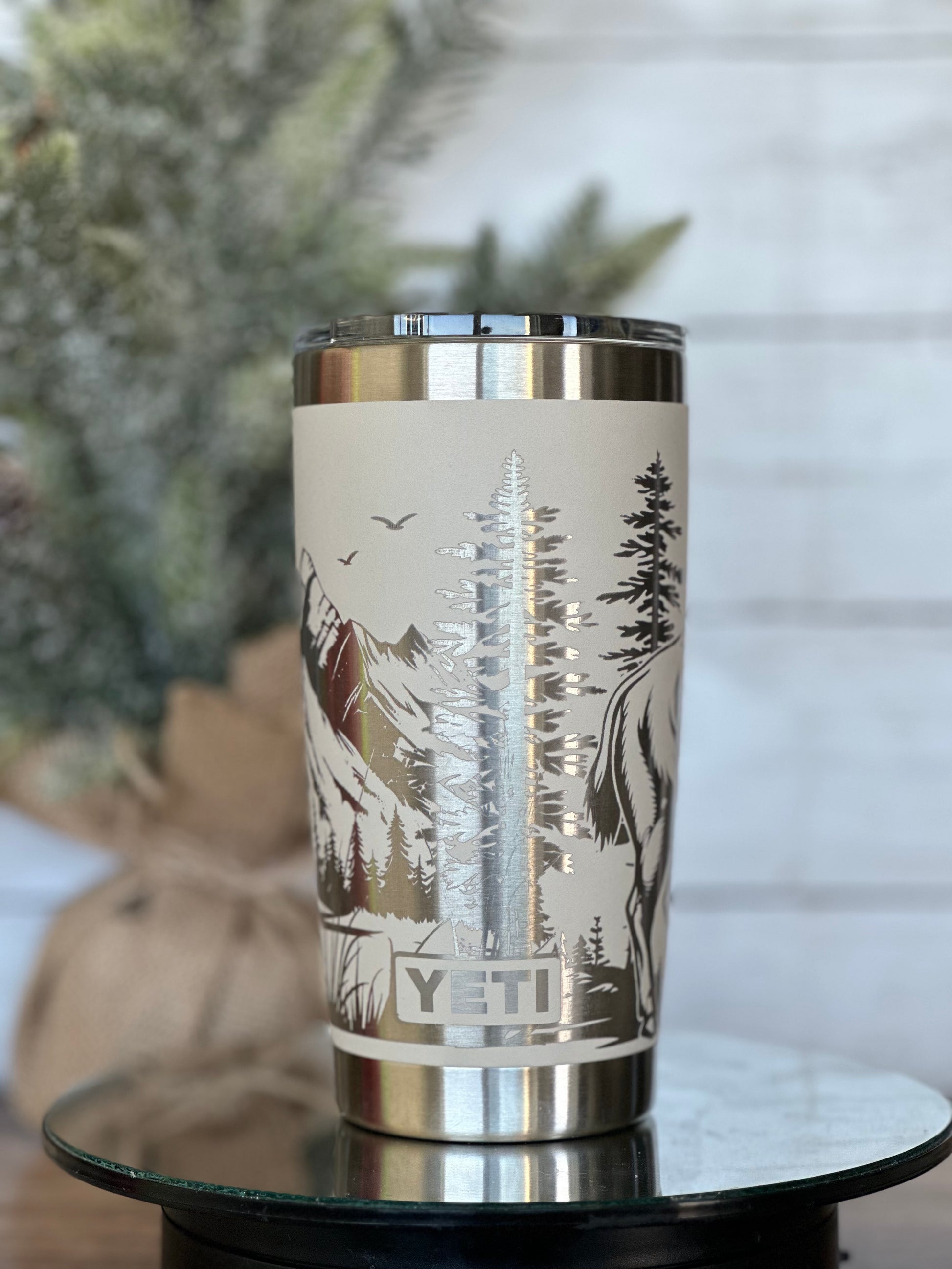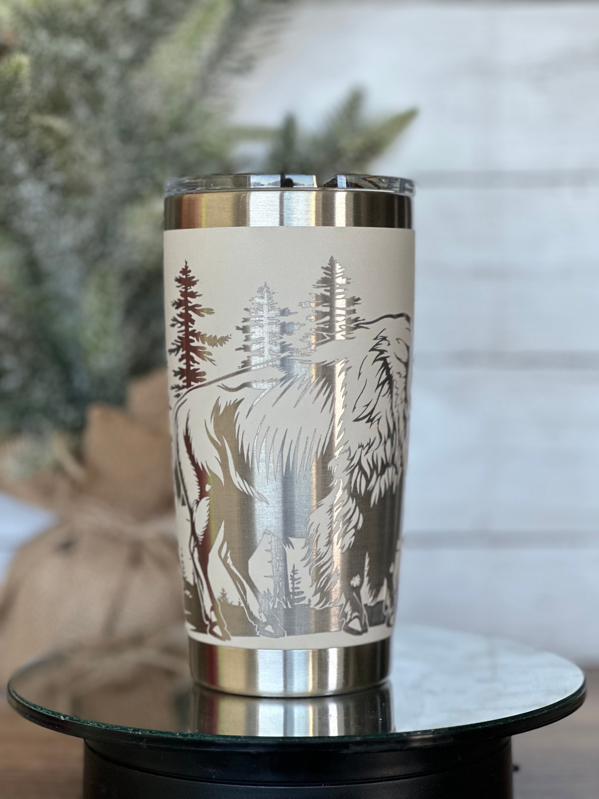 Take the spirit of the great outdoors wherever you go with this YETI Bison Mountain Tumbler. Featuring a striking engraved design of a powerful bison set against a breathtaking mountain landscape with trees, rivers, and birds, this tumbler is perfect for adventurers, nature lovers, and YETI collectors alike.