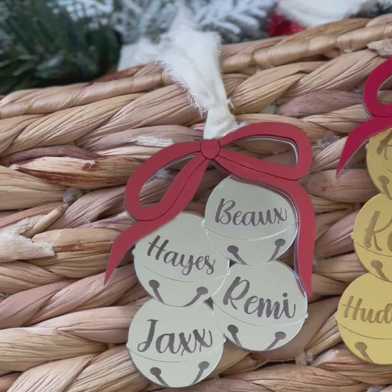 Celebrate the magic of the season with this personalized jingle bell family ornament, designed to feature every member of your family in a festive and meaningful way! Each ornament is crafted with layered acrylic and includes individual jingle bell tags engraved with the names of your choice, all tied together with a charming bow and ribbon hanger.