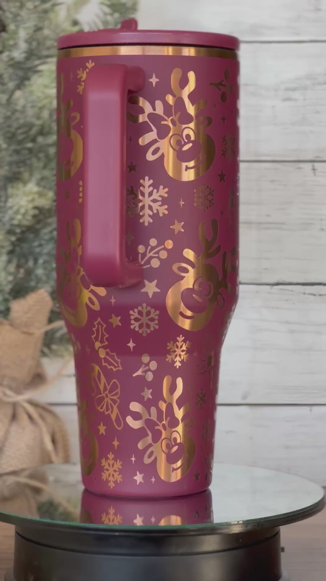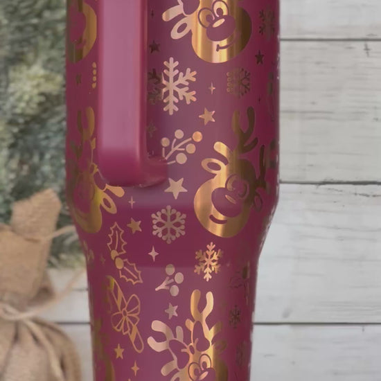 Sip in seasonal style with this limited-edition Hydrojug tumbler! Featuring a rich burgundy red matte finish with metallic gold accents, this holiday cup is beautifully decorated with playful reindeer faces, holly leaves, snowflakes, stars, mistletoe, and candy canes — a true celebration of Christmas spirit.