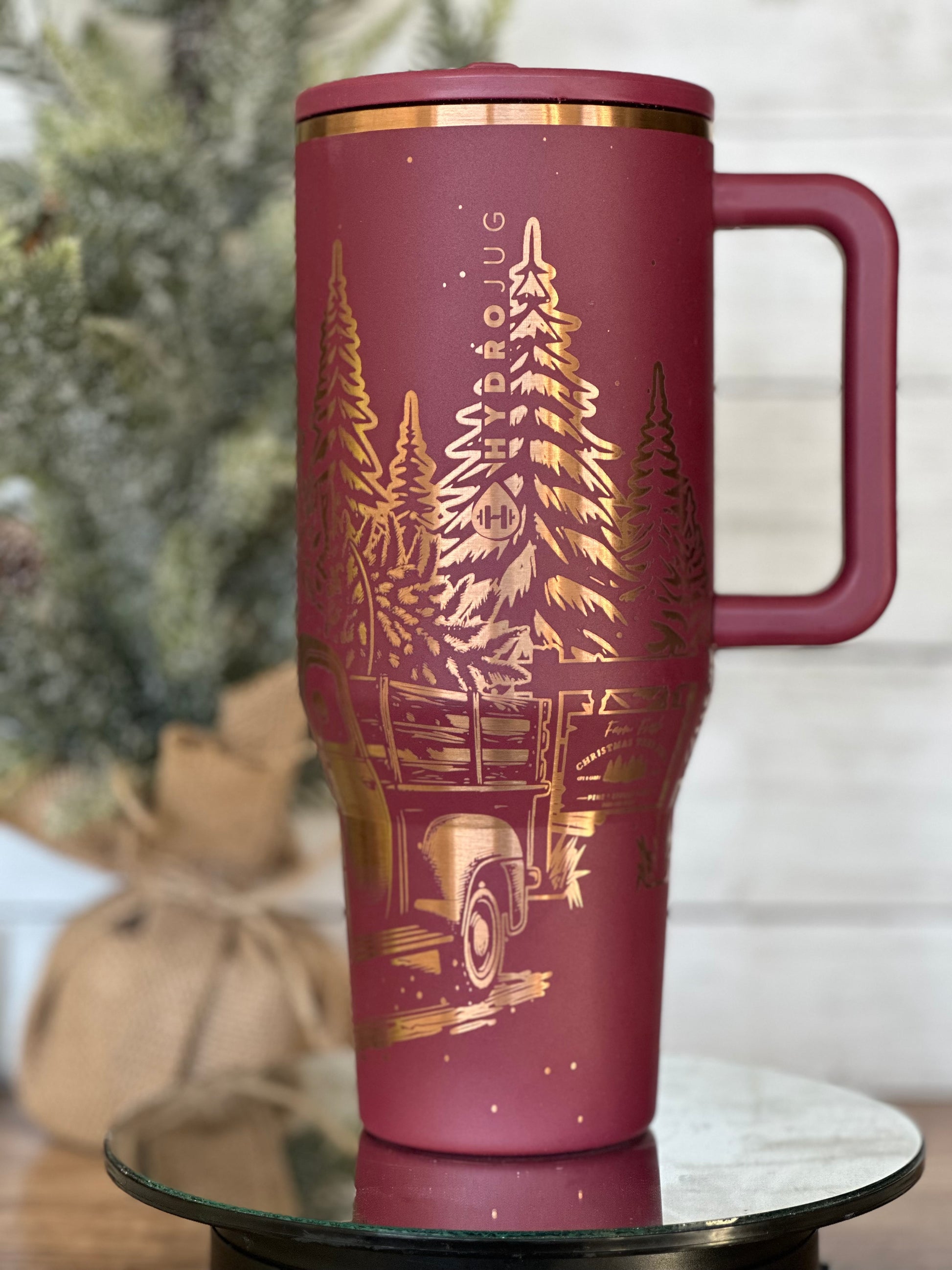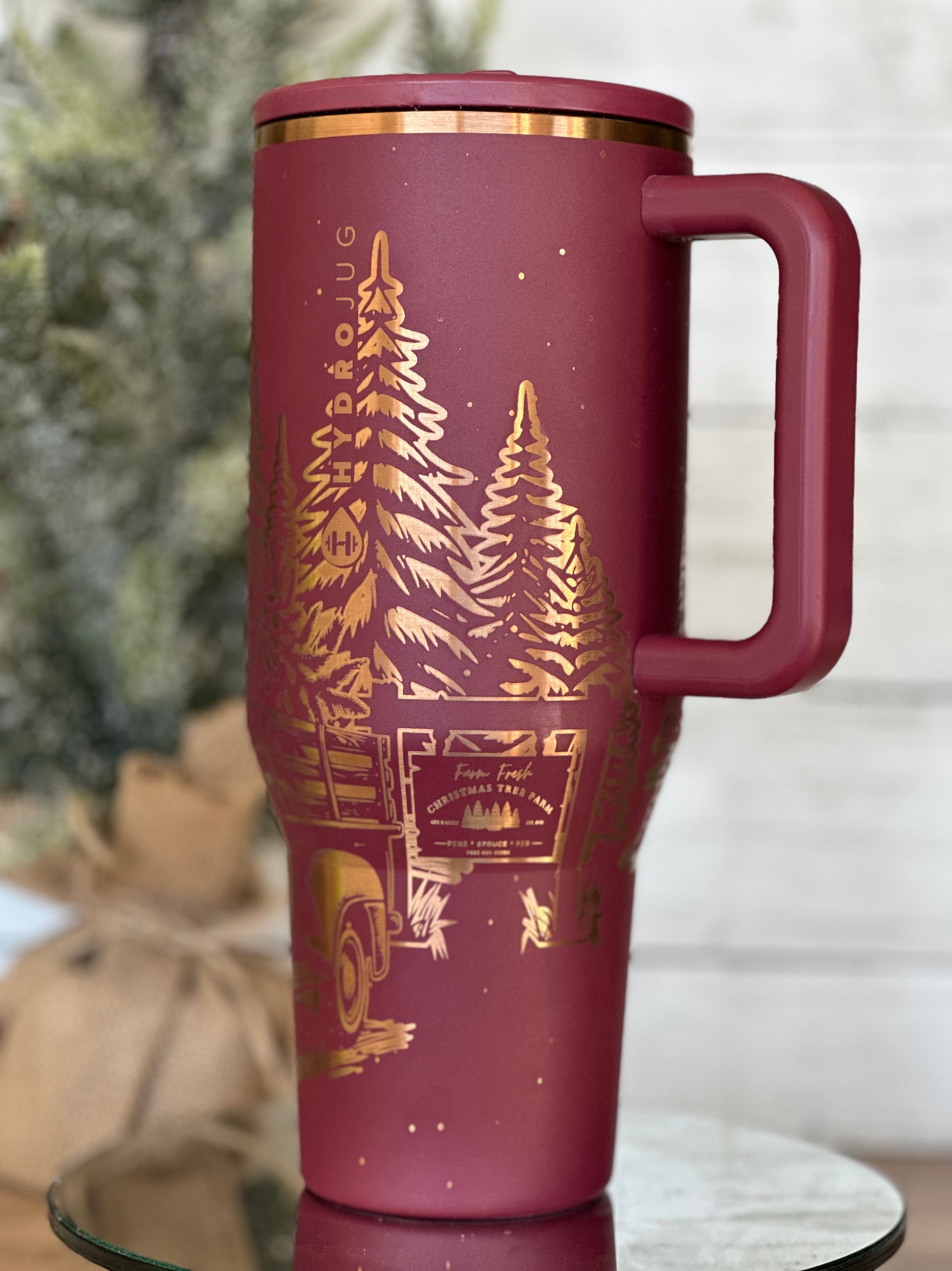 Bring holiday cheer to your hydration routine with this limited-edition HydroJug cup! Designed in a festive deep burgundy color with shimmering gold accents, this insulated tumbler features a nostalgic Christmas tree farm scene complete with a vintage pickup truck hauling fresh-cut evergreens.