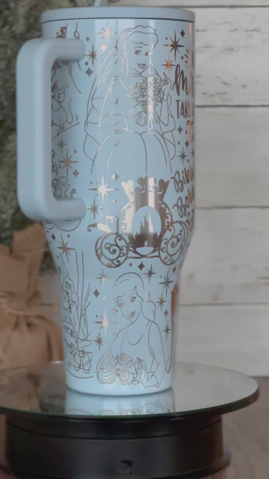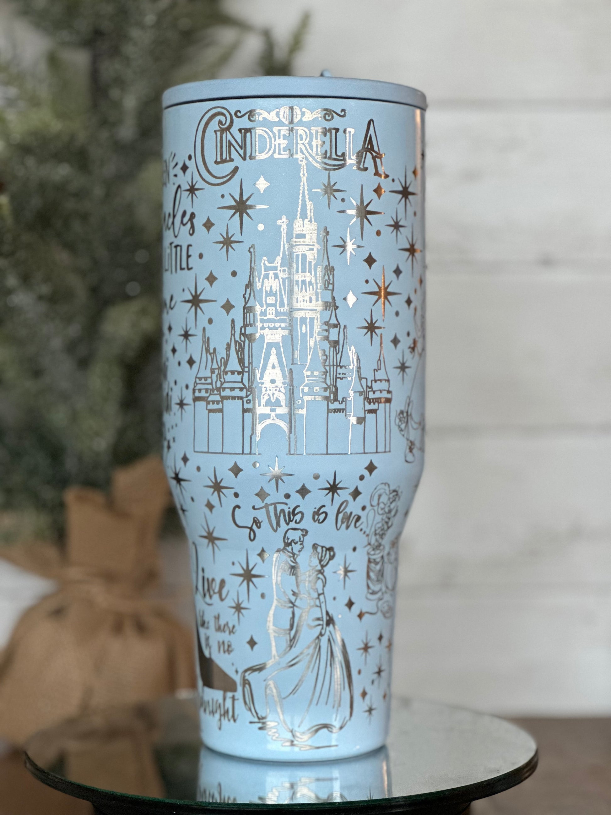 Bring a little magic to your everyday hydration with this Cinderella-inspired Hydrojug. Designed in a dreamy light blue with elegant silver etched artwork, this tumbler features beloved fairy-tale quotes, whimsical stars, a castle silhouette, and classic Cinderella scenes that wrap all the way around the cup.