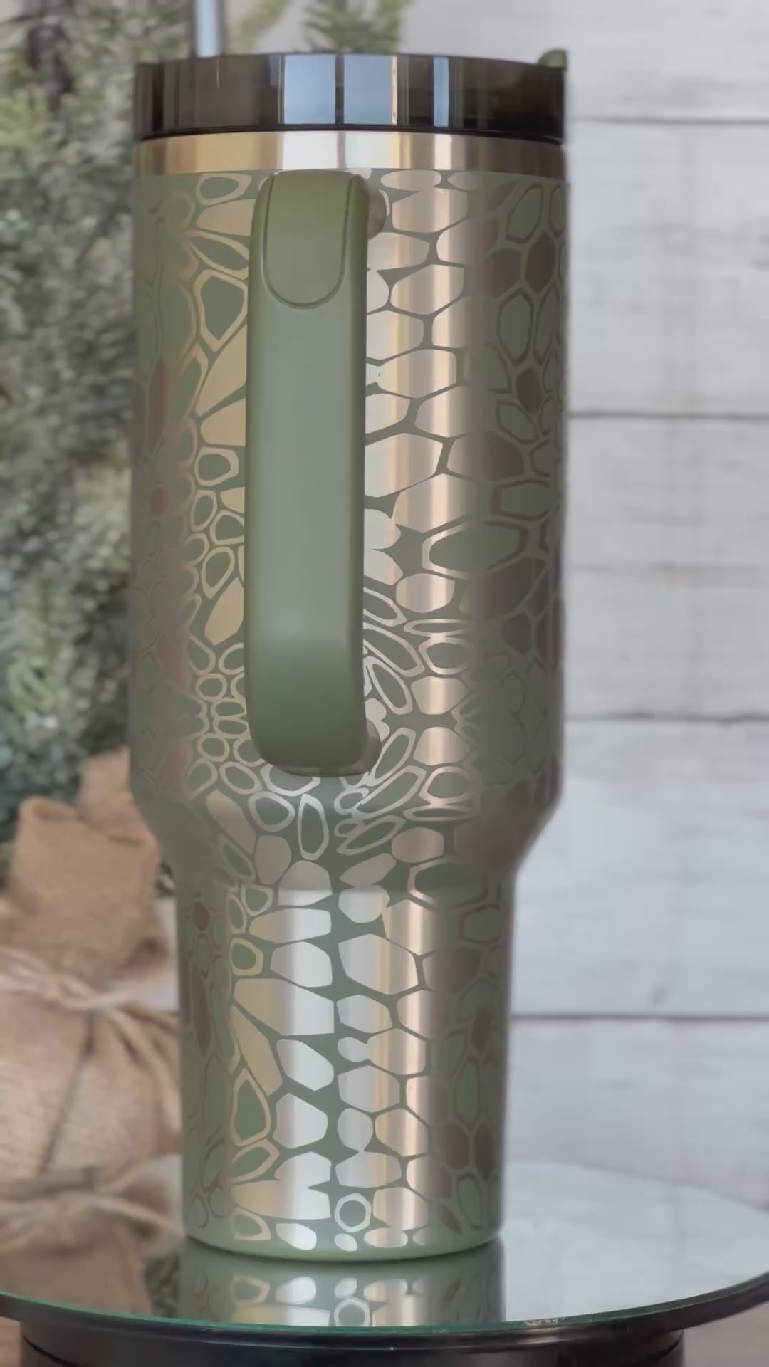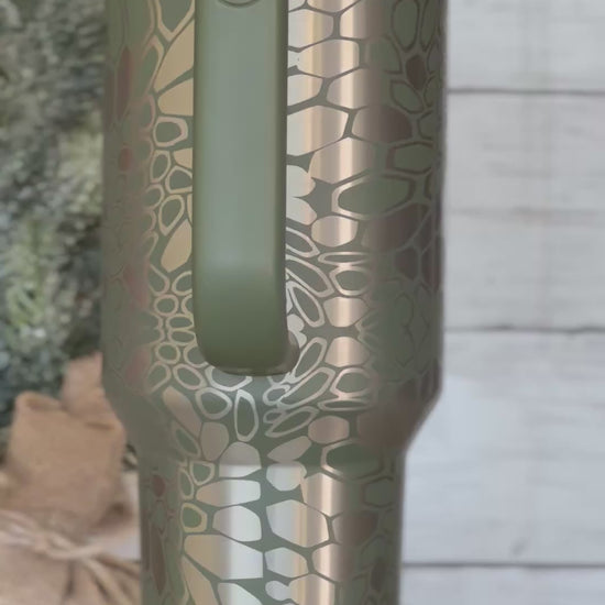 Stay rugged, ready, and hydrated with this bold camo-inspired Stanley tumbler. Featuring a sleek metallic base wrapped in a reptile-scale camo design with an earthy green handle and lid, this cup is perfect for outdoor enthusiasts, hunters, and anyone who loves a tough, adventurous look with everyday function.