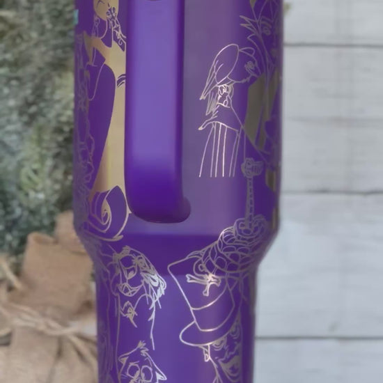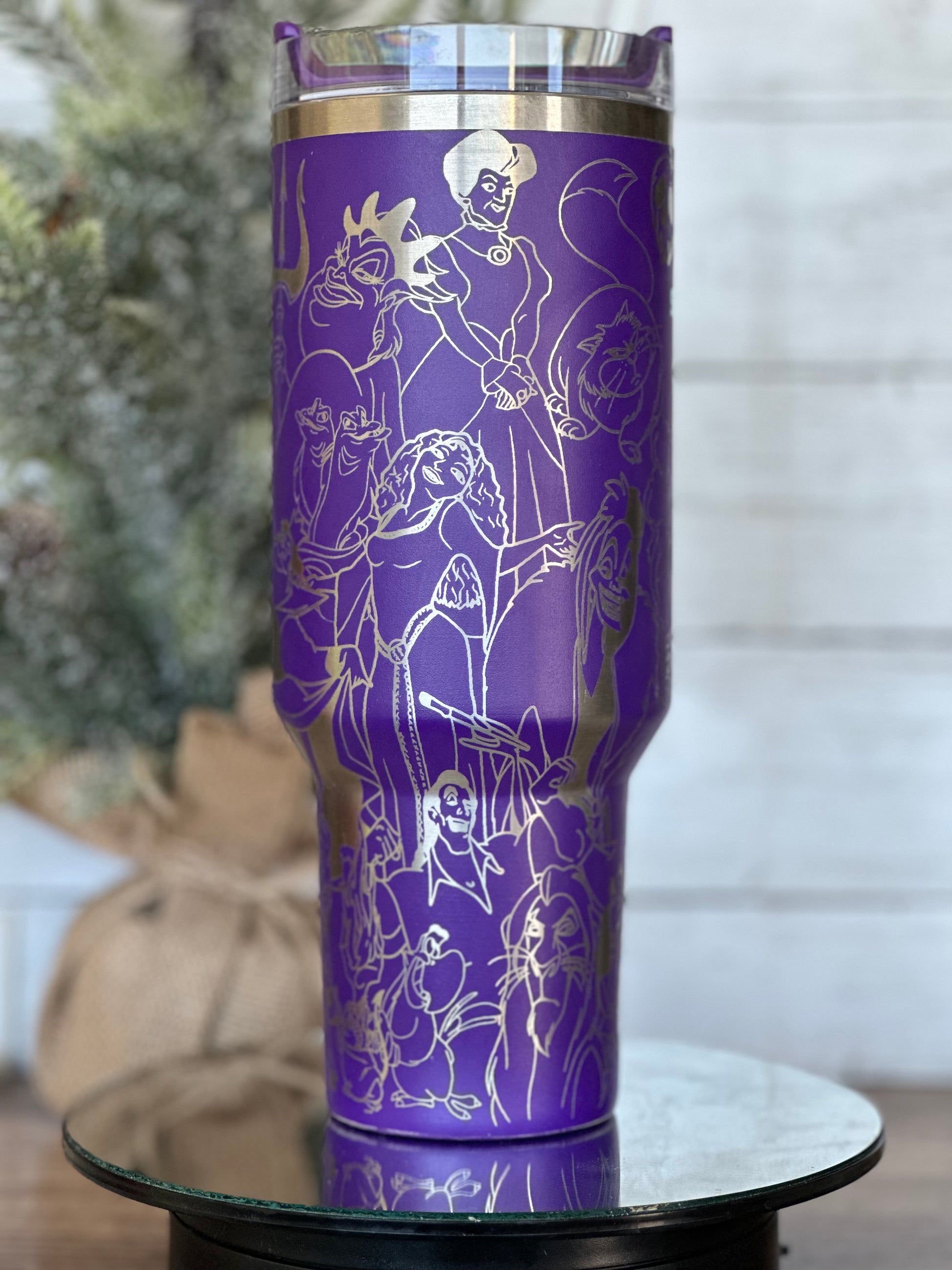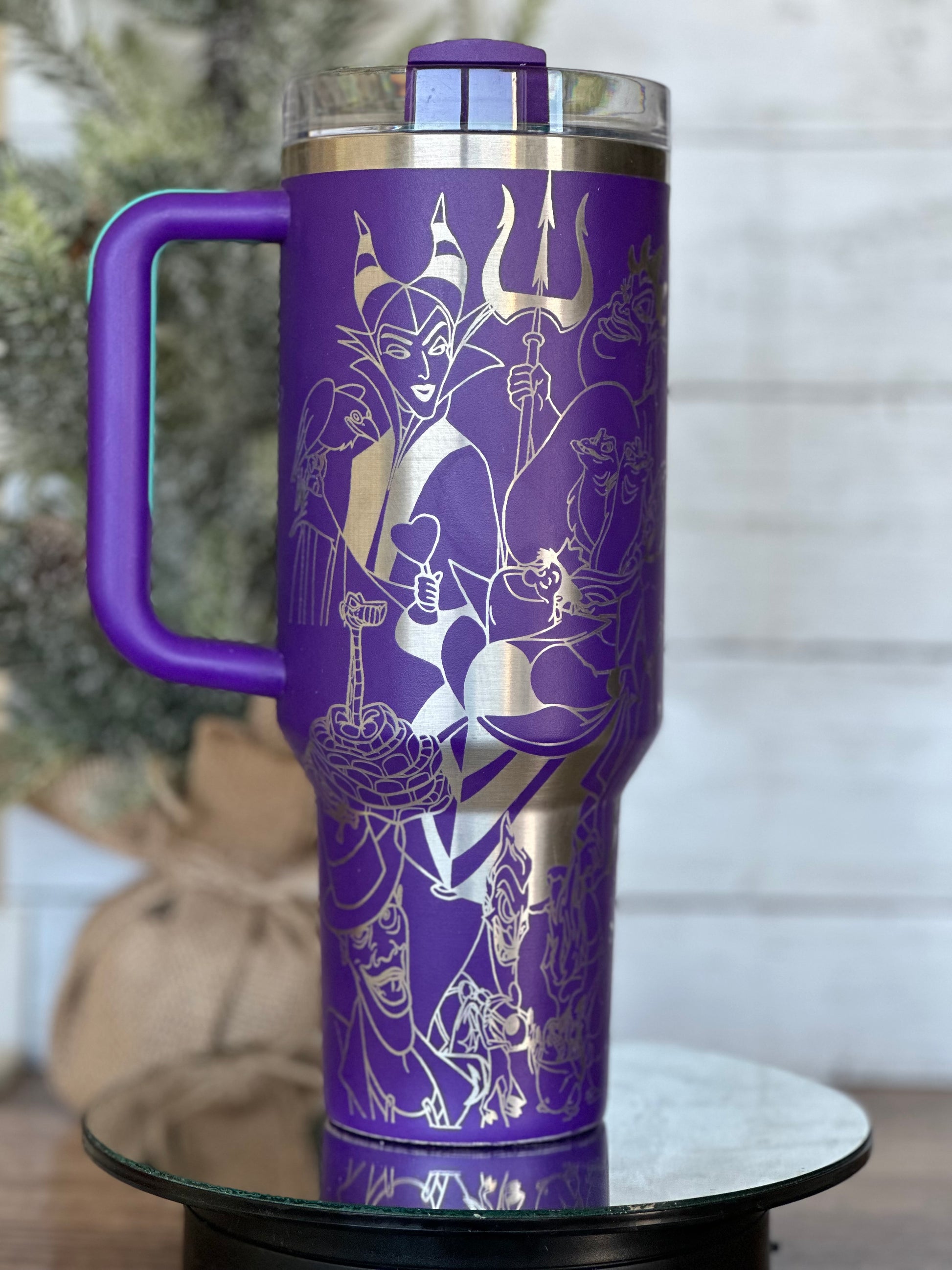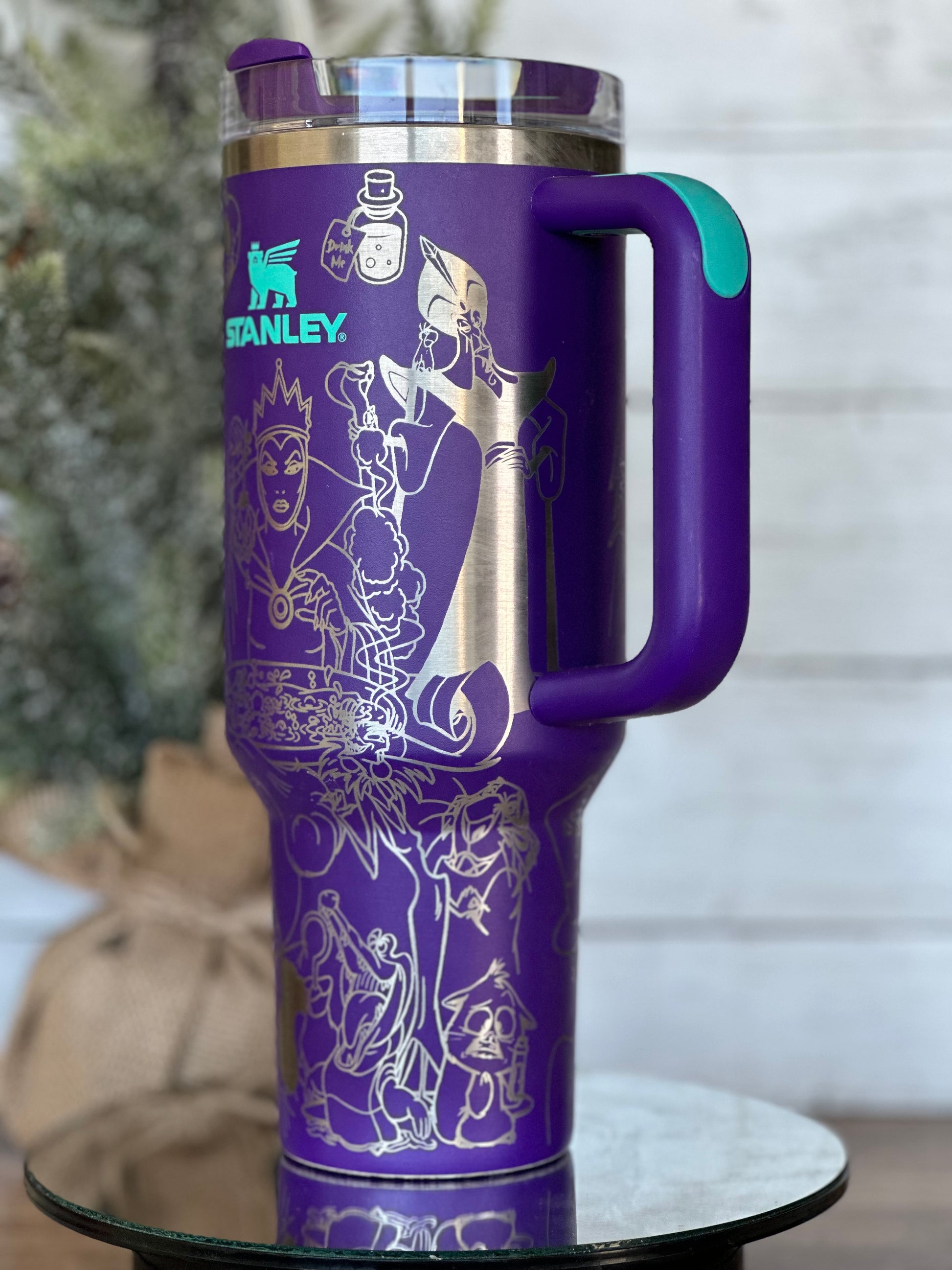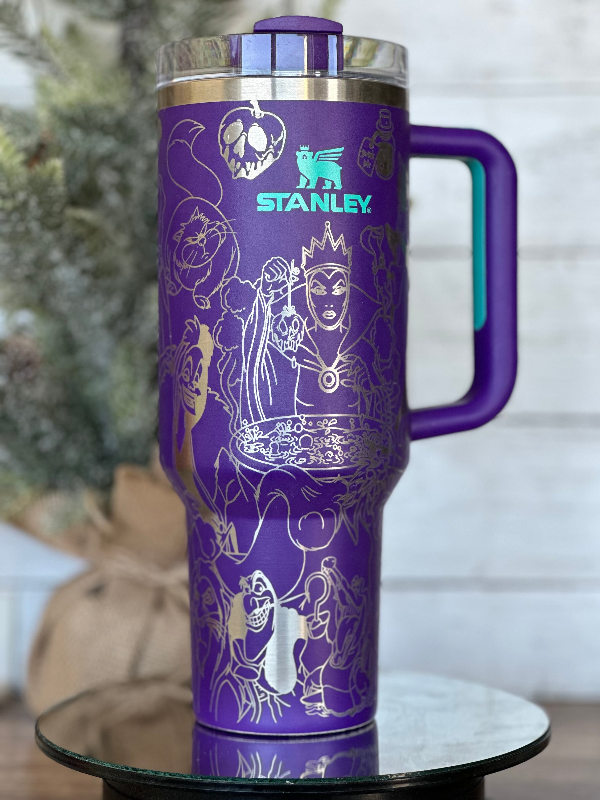 Unleash your wicked side with this bold Disney Villains Stanley Cup. Designed in a striking purple finish with silver engraved artwork, this tumbler showcases iconic villains including Maleficent, Ursula, the Evil Queen, Cruella de Vil, and more. Perfect for Disney fans who love the darker side of the magic, this cup combines a fierce design with Stanley’s unmatched durability.
