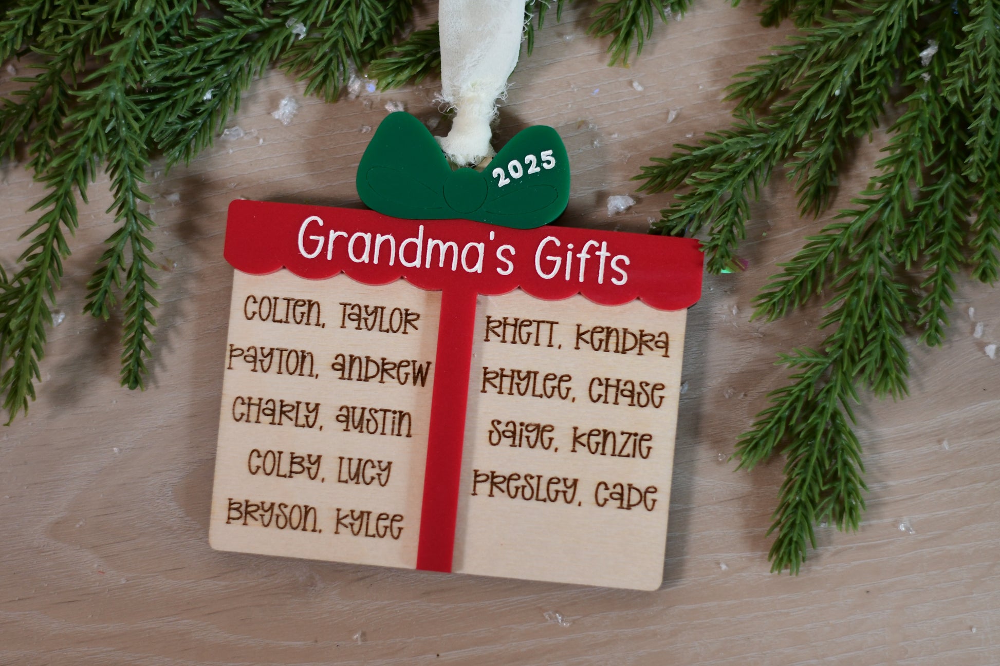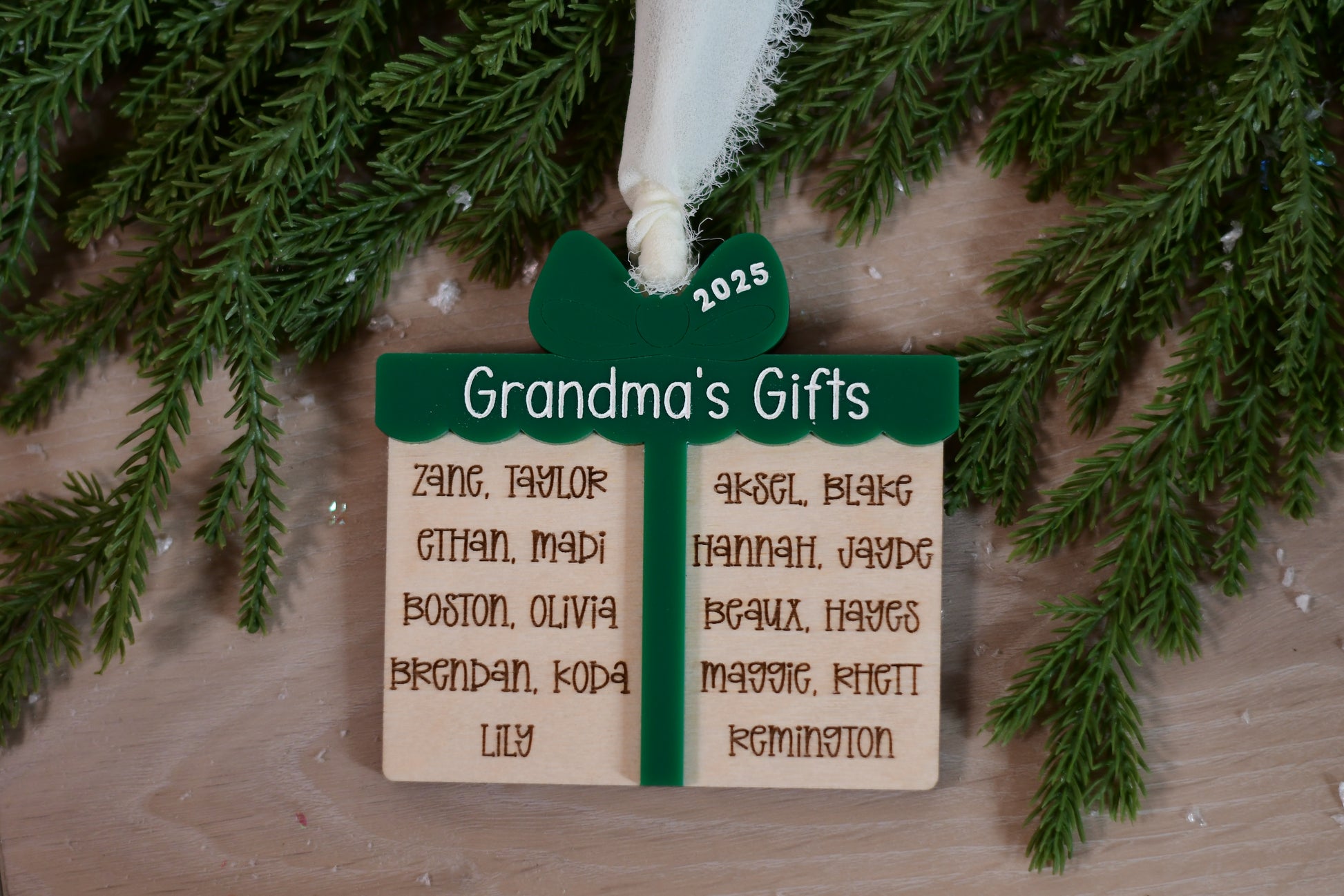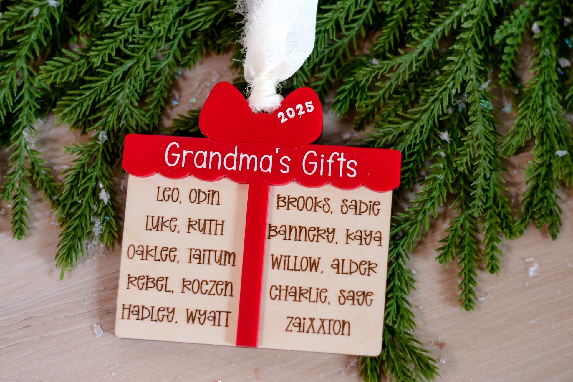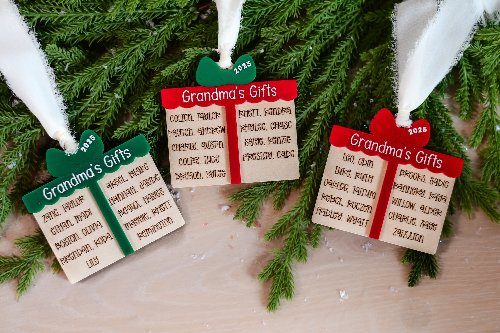 Shaped like a charming gift box topped with a festive bow, this ornament features engraved names of each grandchild, making it a truly meaningful piece to display on the Christmas tree year after year. The soft peach accent color adds a warm, modern touch, while the natural wood base brings a timeless, rustic feel.