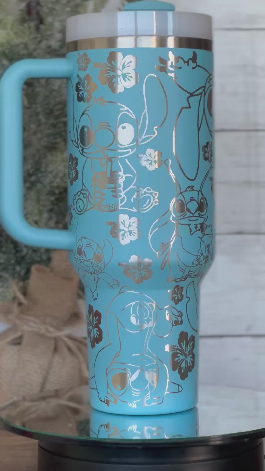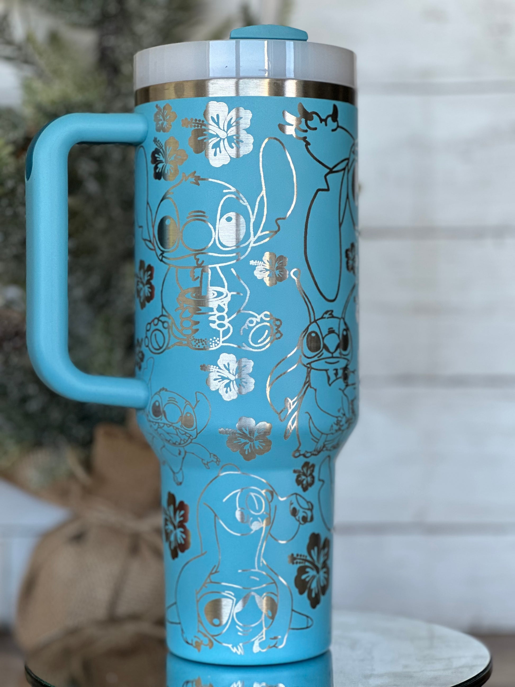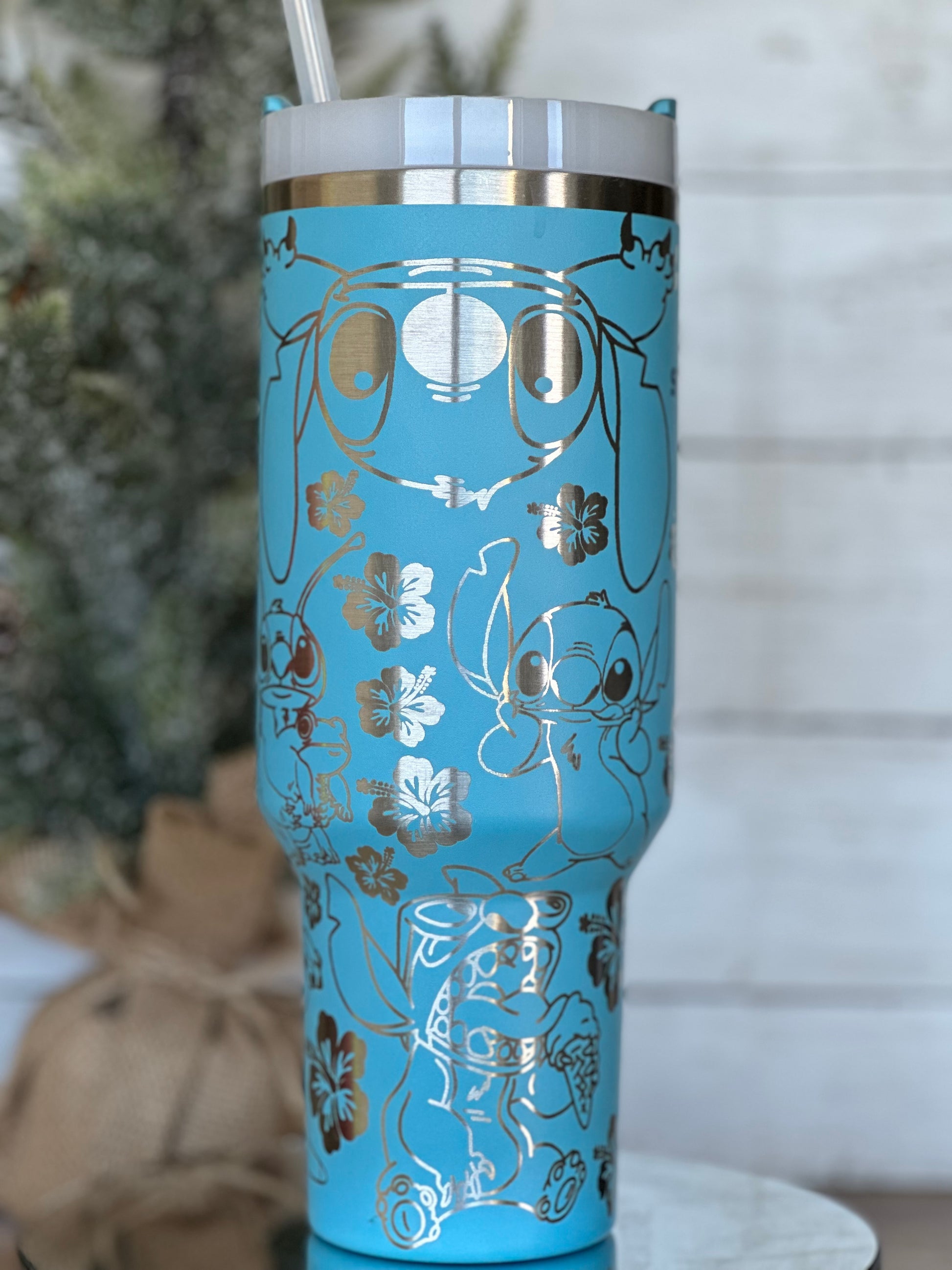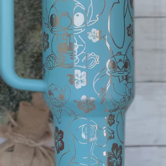 Bring a little bit of ohana everywhere you go with this adorable Disney Stitch Stanley Cup. Featuring a bright blue finish with silver engraved artwork of Stitch surrounded by tropical hibiscus flowers, this tumbler is as fun as it is functional. The playful design captures Stitch’s mischievous personality, making it the perfect companion for fans of Disney’s Lilo & Stitch.