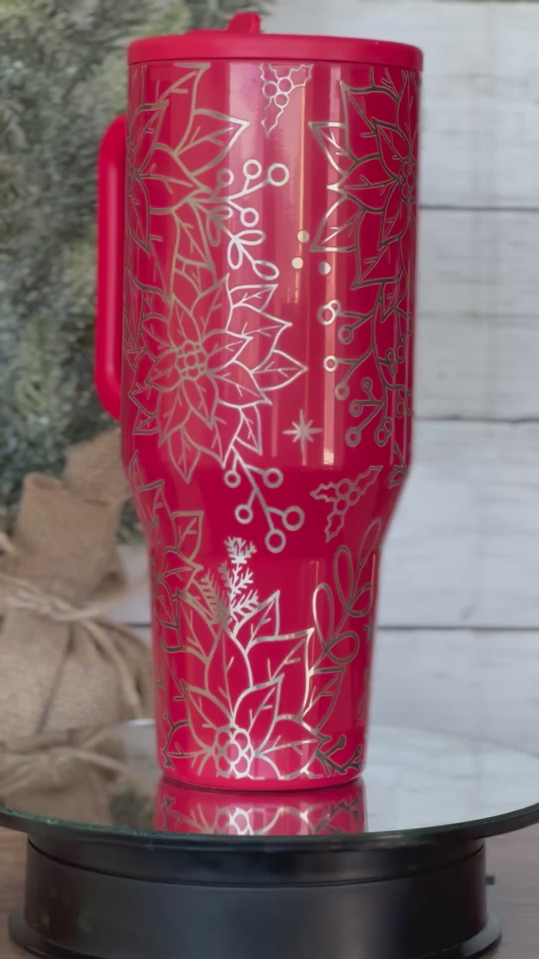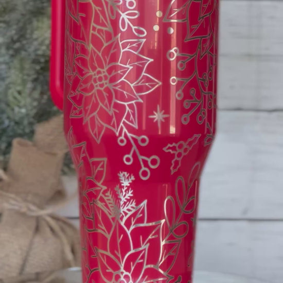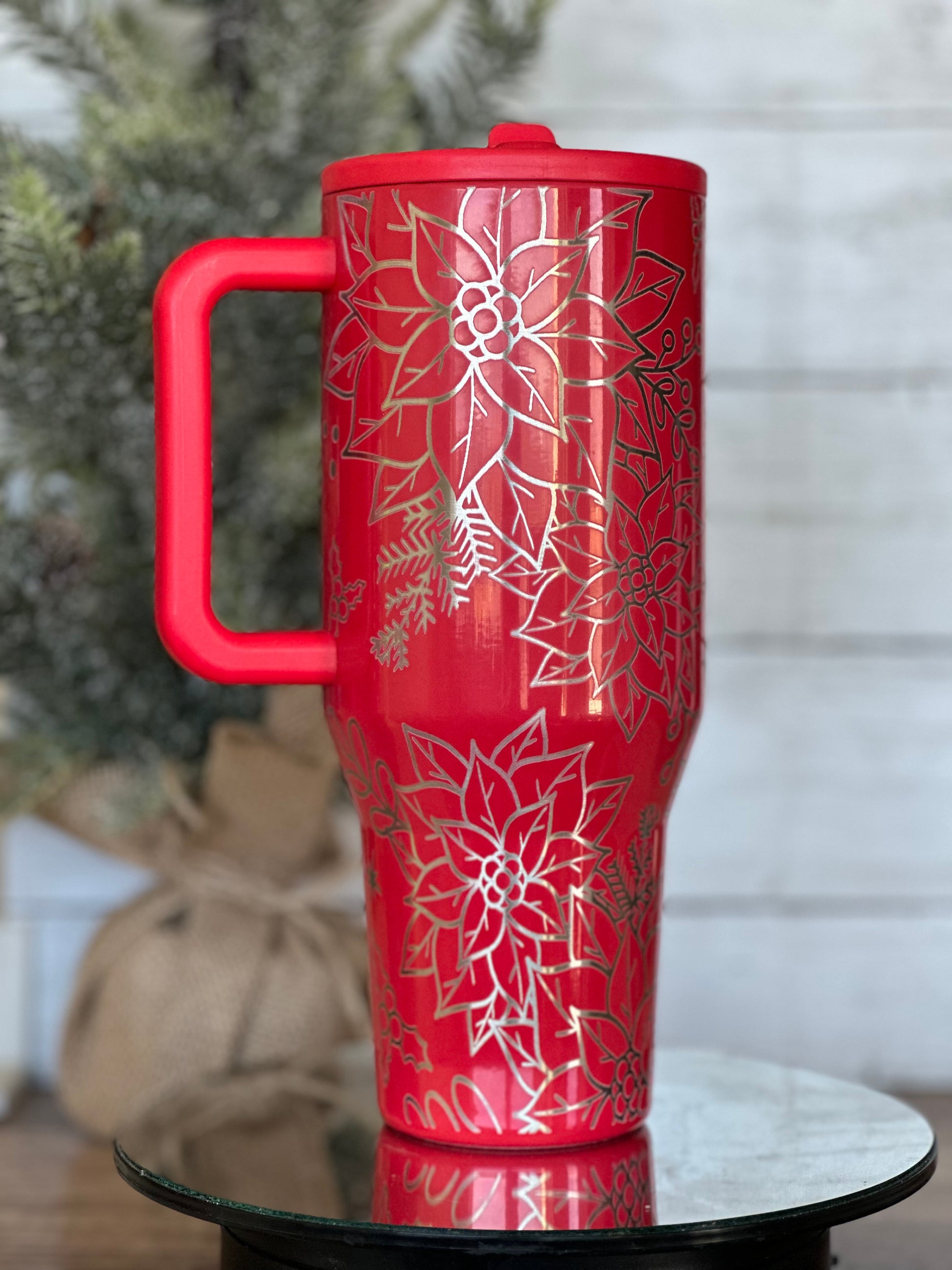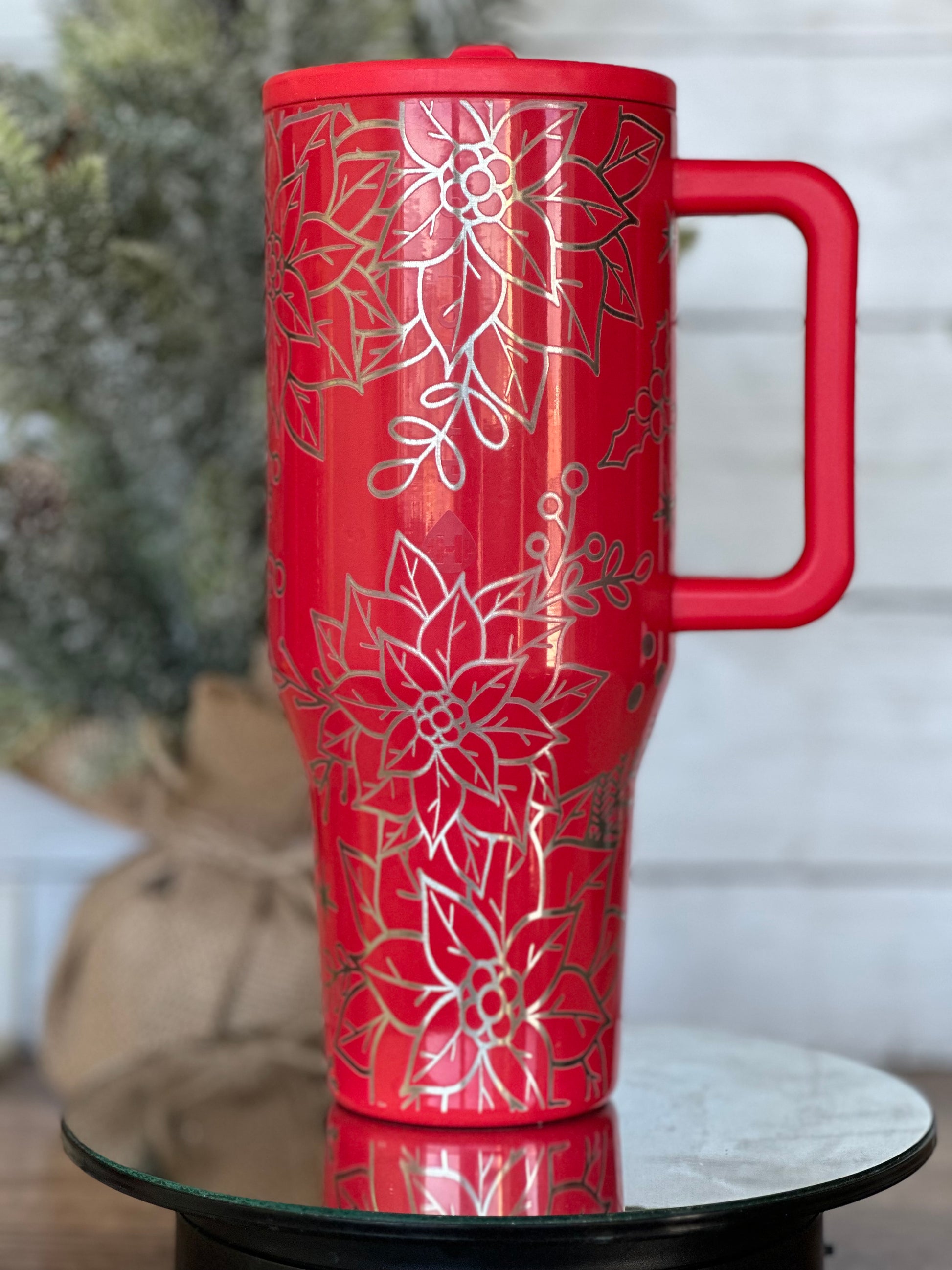Sip the season in style with this stunning holiday-themed tumbler! Featuring an elegant metallic poinsettia and holly design on a vibrant red background, this festive cup is perfect for keeping your favorite drinks hot or cold all winter long.