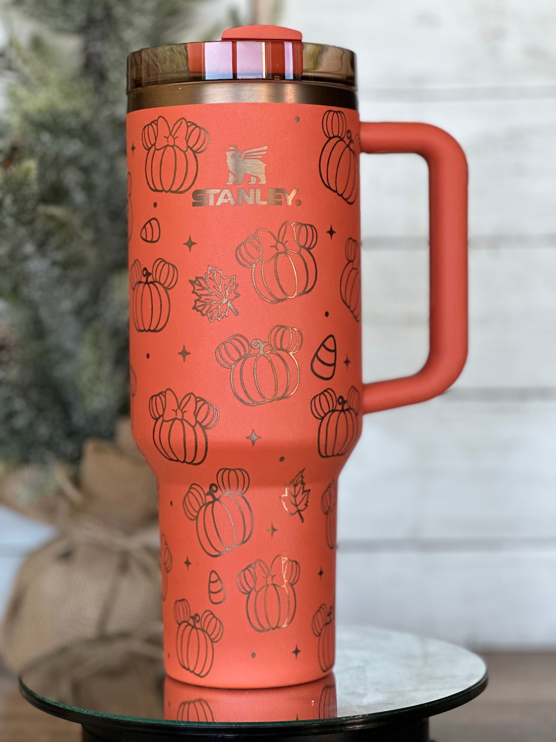 Celebrate the cozy season in style with this autumn-inspired Stanley tumbler! Featuring playful pumpkin designs (complete with cute bow accents), candy corn, and fall leaves on a warm orange base, this cup is the perfect companion for pumpkin spice lattes, cider, or your favorite cold drinks all season long.