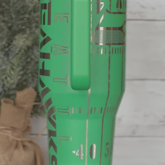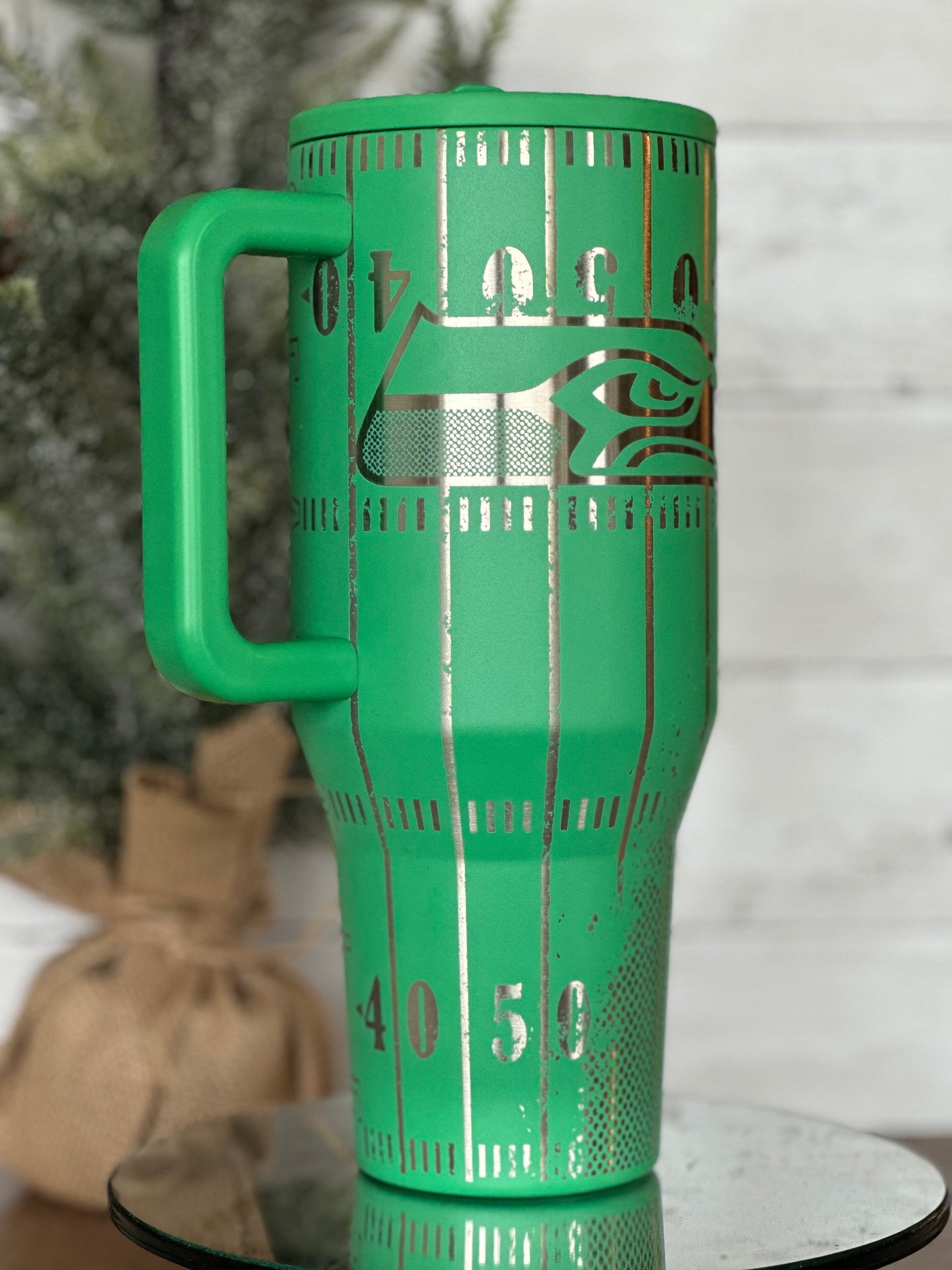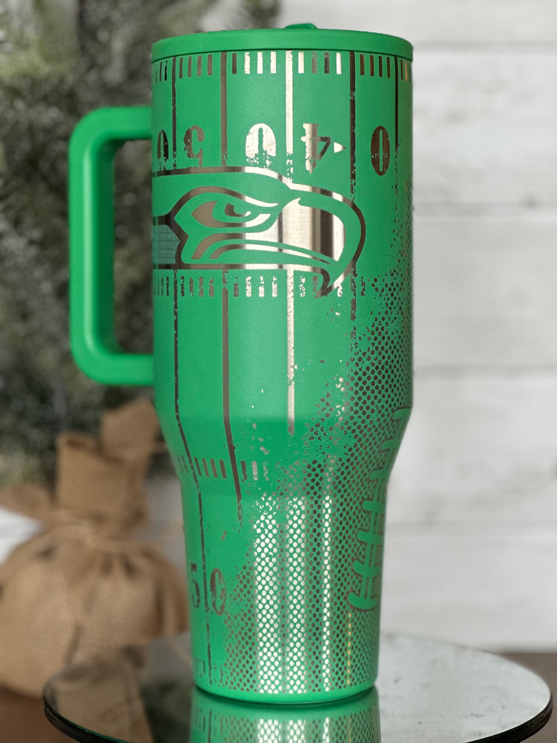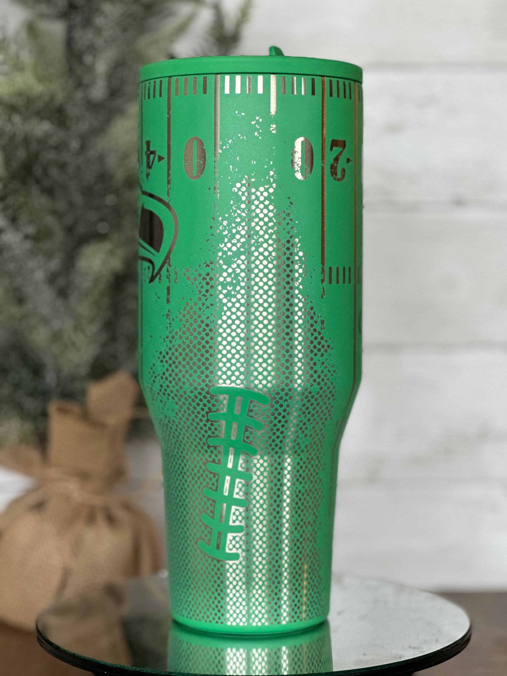 This cup showcases a full-wrap football field design with yard line markings, textured metallic detailing, and a statement team word mark or emblem, giving it a high-end, custom look. The brushed metallic accents contrast beautifully against the matte base color, creating a dimensional, engraved-like finish that stands out from ordinary tumblers.