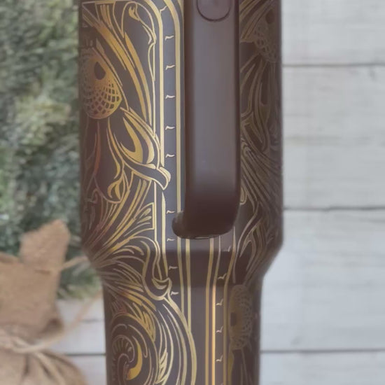 Make a bold statement with this stunning Custom Engraved Stanley Quencher, featuring an elegant gold floral scroll design that wraps beautifully around the entire cup. This tumbler combines the trusted durability of Stanley with the luxury of detailed artwork, creating the perfect everyday cup for those who love style and function.
