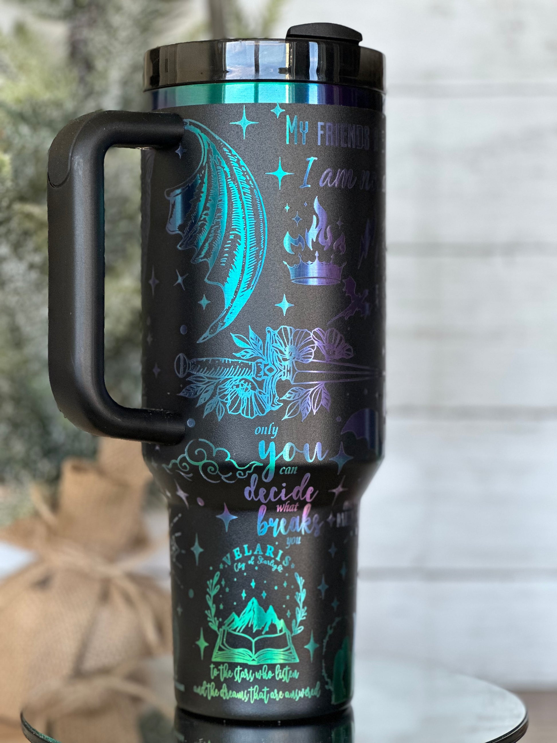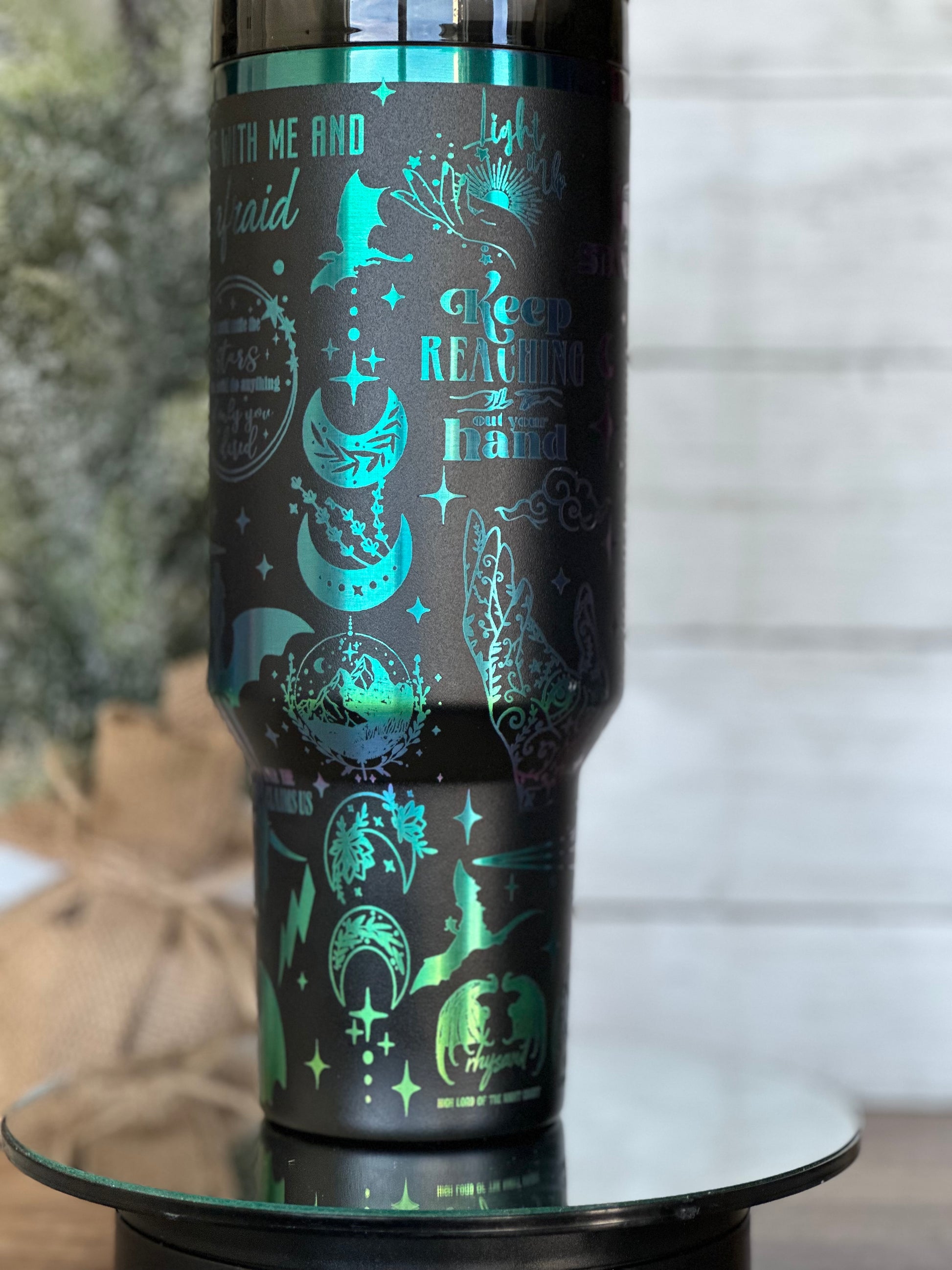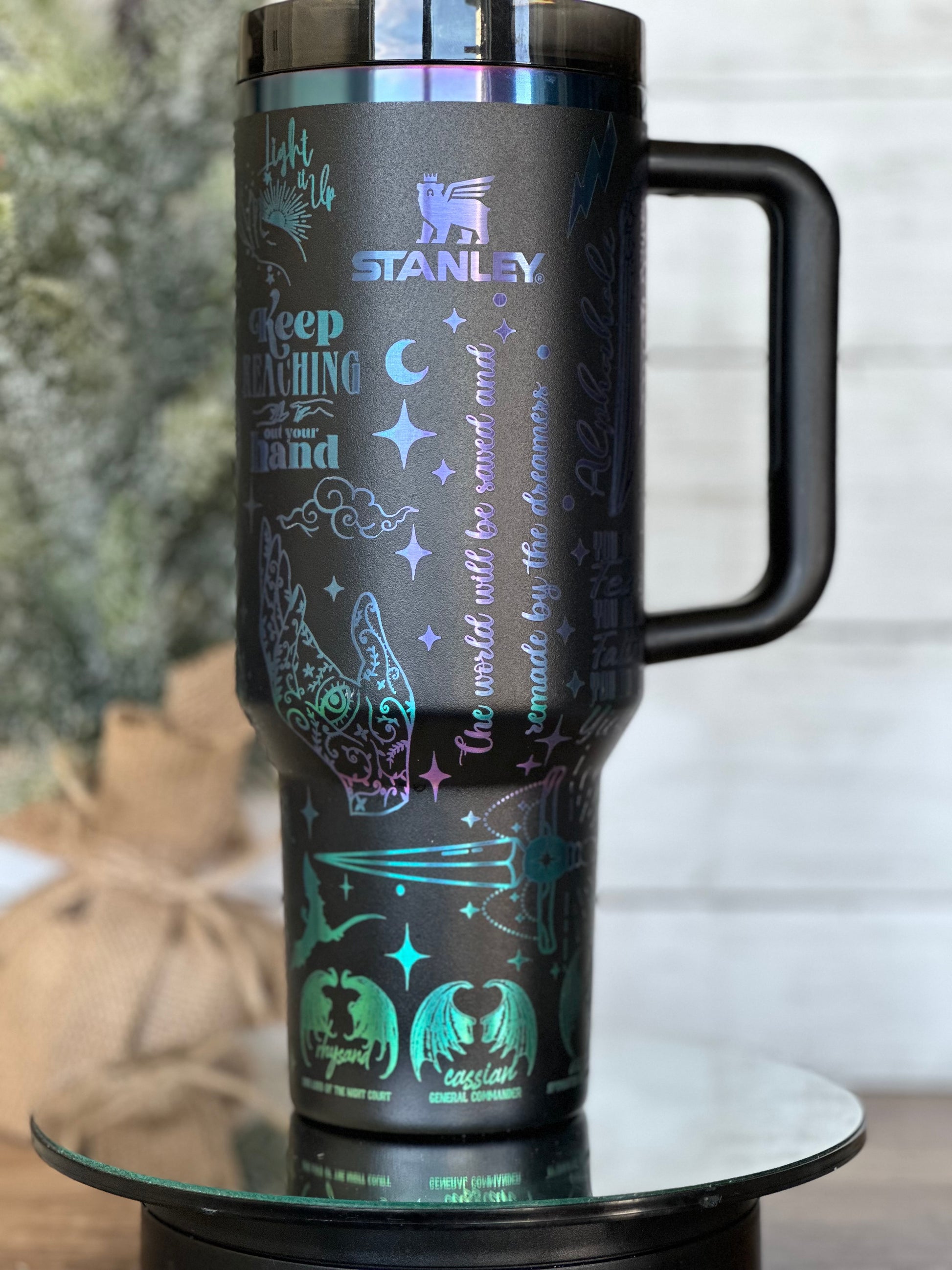 Bring magic, motivation, and style to your everyday hydration with this custom engraved Stanley 40oz Quencher Tumbler. Featuring iridescent fantasy-inspired artwork, empowering quotes, and celestial designs, this cup is perfect for fans of whimsical, bookish, and mystical aesthetics.
