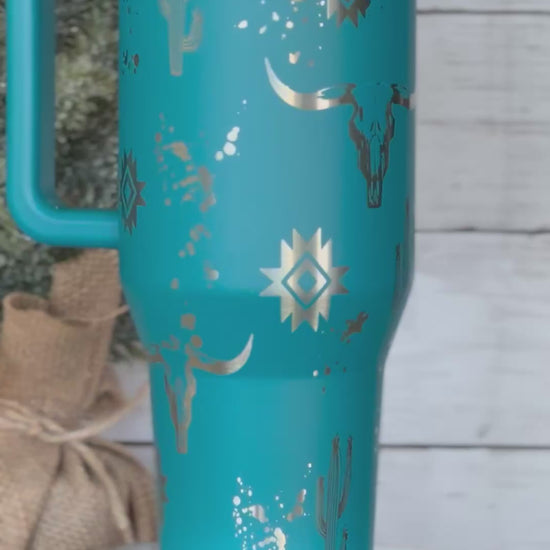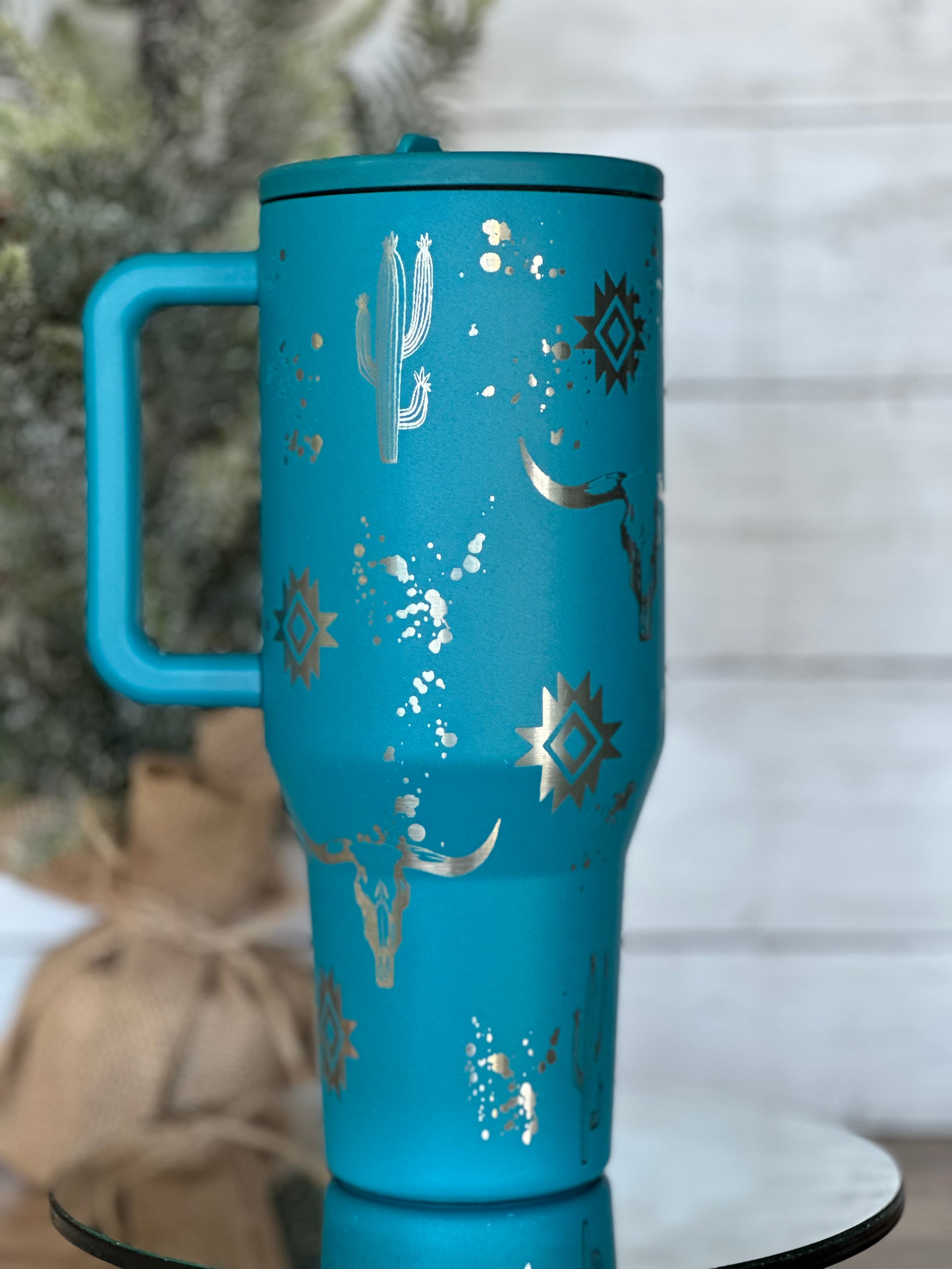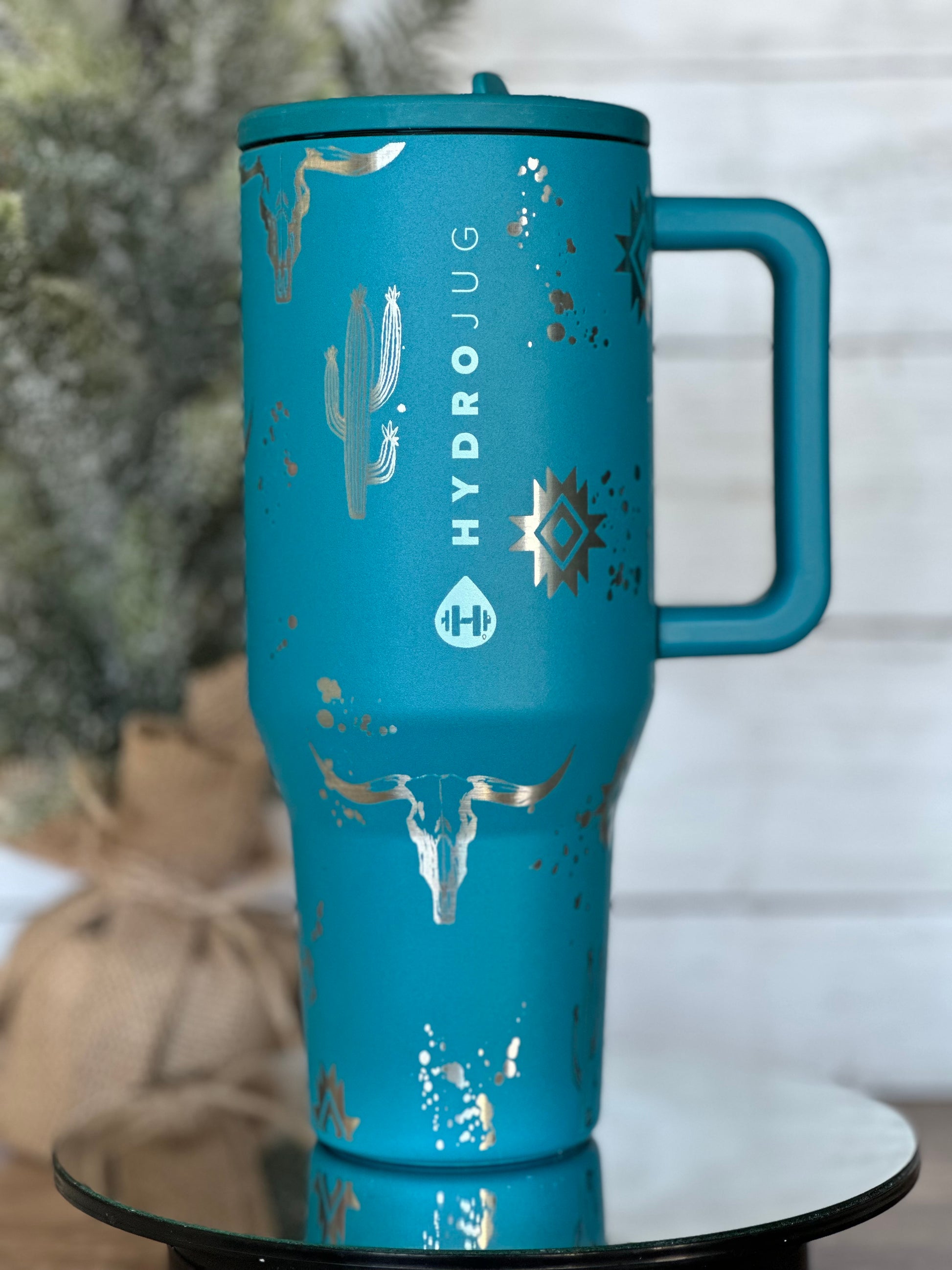 Stay stylishly hydrated with the HydroJug Western Desert Tumbler, a 32oz insulated stainless steel mug designed with a bold southwestern flair. Featuring a vibrant turquoise finish and metallic desert-inspired artwork—including cactus, longhorn skulls, and geometric tribal accents—this cup is the perfect mix of function and fashion.