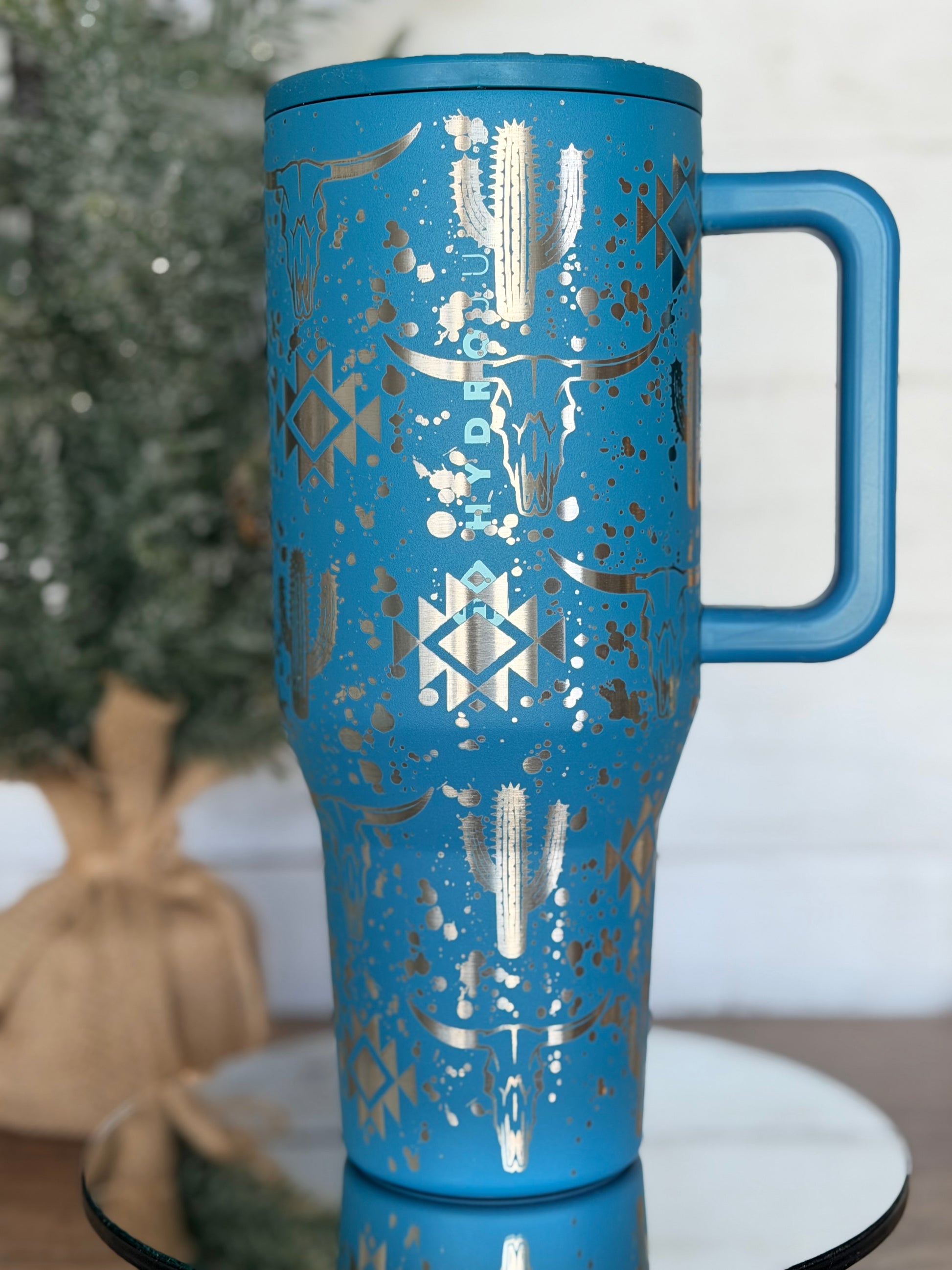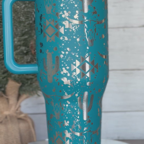 Bring a bold western vibe to your everyday drinkware with this laser engraved Hydrojug Traveler featuring a stunning desert-inspired design. This tumbler showcases a unique wrap of longhorn skulls, cacti, southwestern geometric patterns, and paint splatter accents, creating a rugged yet stylish look perfect for anyone who loves western or desert aesthetics.